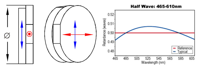Waveplates (retardation plates or phase shifters) are made from materials which exhibit birefringence. The velocities of the extraordinary and ordinary rays through the birefringent material vary inversely with their refractive indices. This difference in velocities gives rise to a phase difference when the two beams recombine. In the case of an incident linearly polarized beam this is given by α=2πd(ne-no)/λ, where is α phase difference; d is thickness of waveplate; ne, no are refractive indices of extraordinary and ordinary rays respectively; λ is wavelength. At any specific wavelength the phase difference is governed by the thickness of the retarder.